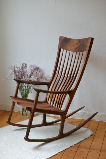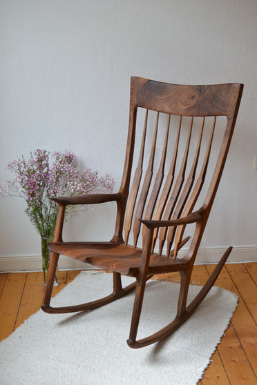 Handgearbeiteter Schaukelstuhl aus Nussbaum im Stile Sam Maloofs. Auch hier wurden nur Holzverbindungen verwendet, keinerlei Schrauben oder andere Metallverbindungen.